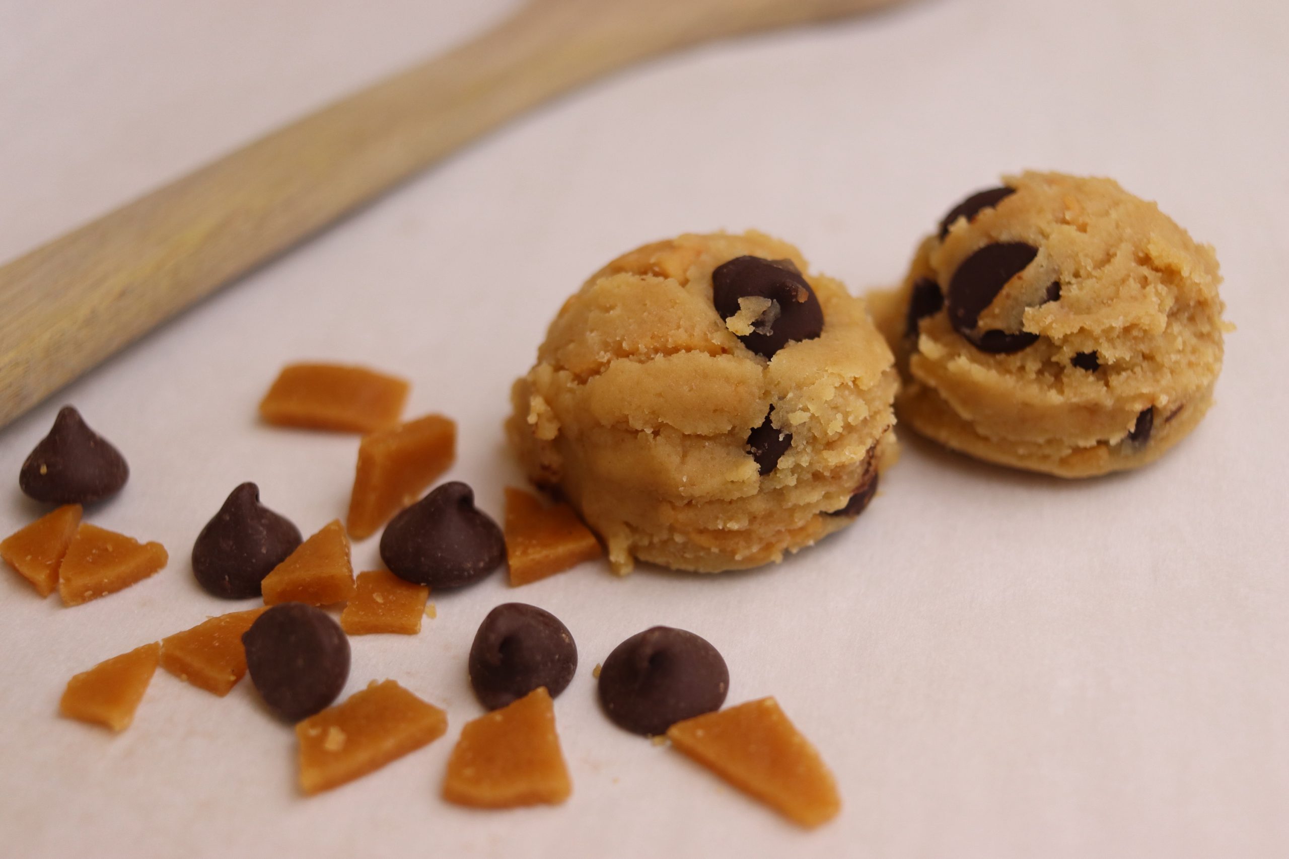 Browned butter cookie dough with dark chocolate chips and homemade toffee pieces. Rich, buttery, and irresistibly indulgent. Trust me, you’re going to love this one! One dozen frozen cookie dough balls, ready to bake in your own kitchen.