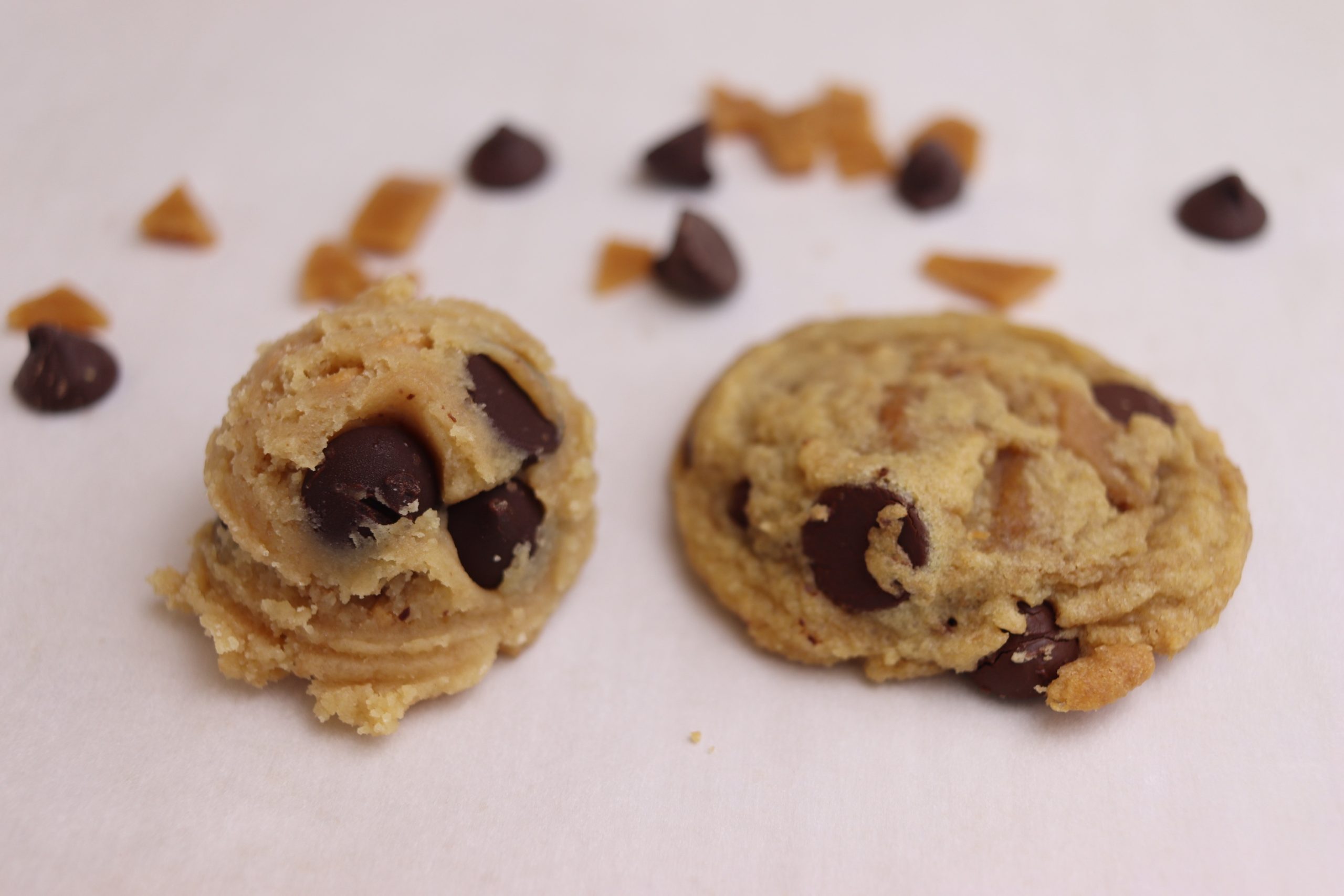 Ingredients: flour, sugar, brown sugar, butter, dark chocolate chips (chocolate, sugar, cocoa butter, milkfat, nonfat milk, natural flavor), toffee pieces (brown sugar, butter, salt), vegan egg replacement mixture (water, potato starch, tapioca flour, baking soda, psyllium husk), water, vanilla extract, salt, baking soda, espresso powder.